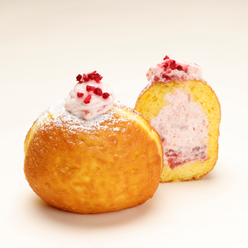 ふんわりとろける生ドーナツに、果肉感のあるいちごジャムと生クリームを合わせたいちごホイップをたっぷり注入しました。フランボワーズをトッピングした、甘酸っぱく贅沢な一品です。